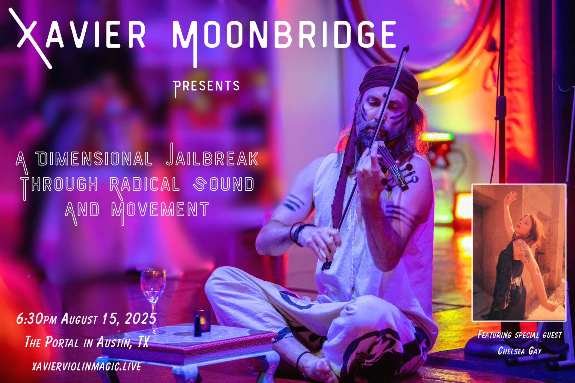 Join Xavier Moonbridge, electric violinist and expressive motion renegade, as he conjures a globadelic fusion of sound and spellbinding movement. Xavier’s solo project, XOsphere, is a sonic voyage rooted in Galveston Island and renowned for igniting inner revolutions through genre-defying compositions.